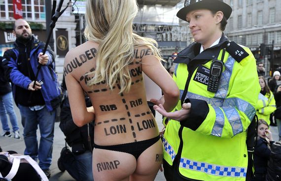 Reino Unido - 13h data 26/01/2012- Policial tenta afastar uma manifestante do Peta que protesta seminua contra o consumo de carne, no centro de Londres.